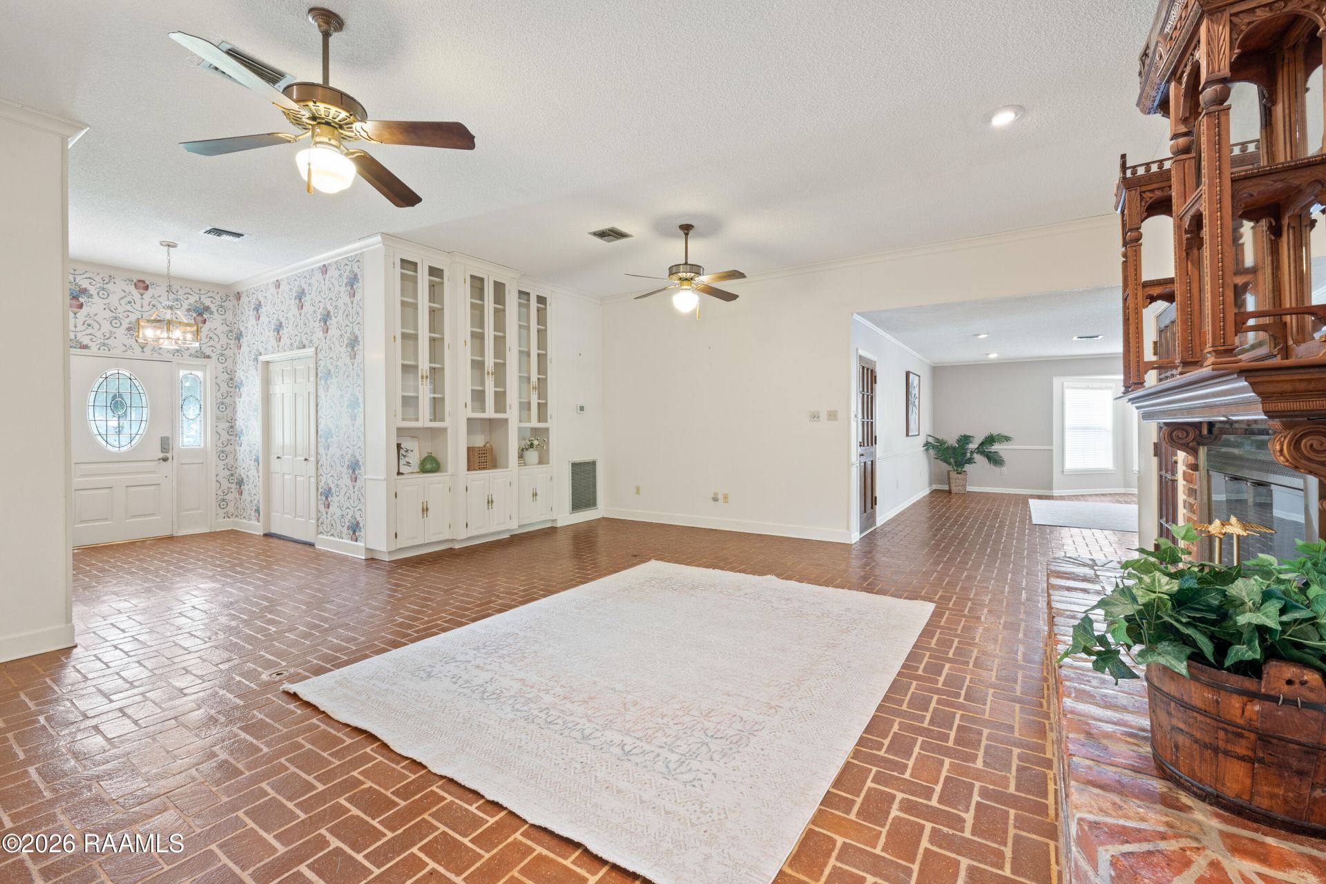 Welcome to prestigious Oakbourne Estates, where this stately 3-bedroom, 3-bath home offers comfort, character, and exceptional space for entertaining. The spacious living area features stunning real brick floors, a cozy brick fireplace, and built-in bookcases, creating a warm and inviting atmosphere.The brick floors continue into the large dining or keeping area that provides flexibility for gatherings, while the sunroom and separate office offer ideal spaces for work and relaxation. The massive primary suite serves as a true retreat, complete with a luxurious bath accented with elegant gold finishes. The two additional bedrooms offer convenient shared bathroom access.The kitchen is well-equipped with many new appliances, abundant cabinet storage, and generous countertop space, ideal for both everyday living and hosting. The oversized laundry room includes a sink, ample counter space, and a full bath for added convenience.Step outside to the beautiful backyard through glass doors, perfect for enjoying the peaceful surroundings. The backyard features multiple fruit trees, and both the front and back yards are equipped with an irrigation system for easy maintenance.Additional highlights include a side-entry garage with mini-split AC for entertaining, a workshop with a window unit and built-in shelving, and covered carport or RV parking with electrical hookups. A newer roof and striking leaded glass front door complete this solidly built home full of charm in one of the areas most sought-after neighborhoods.